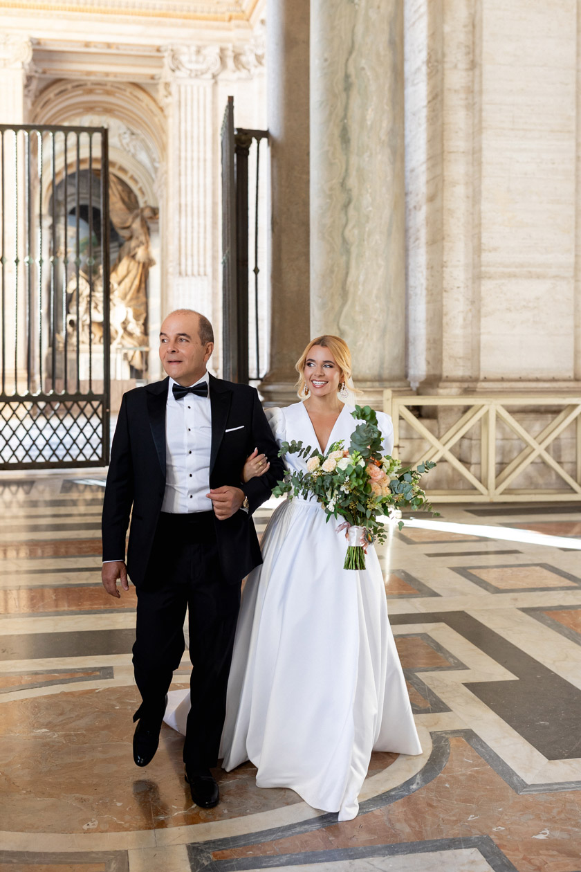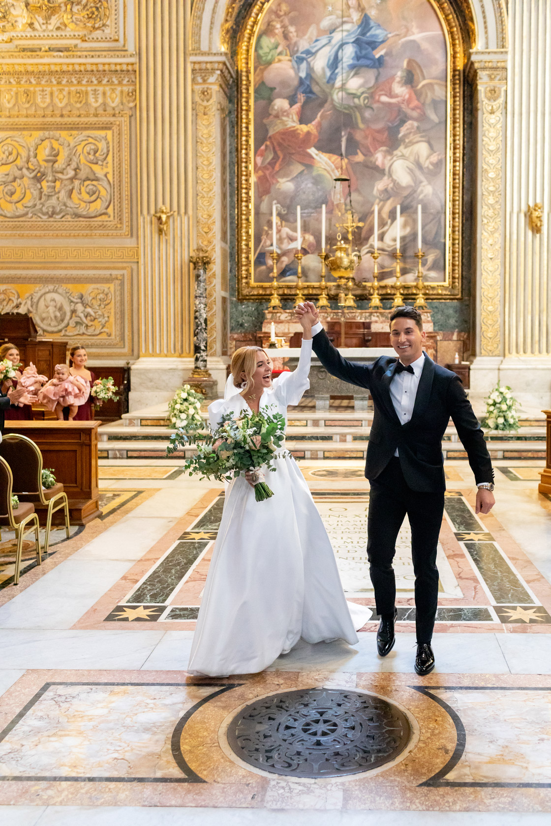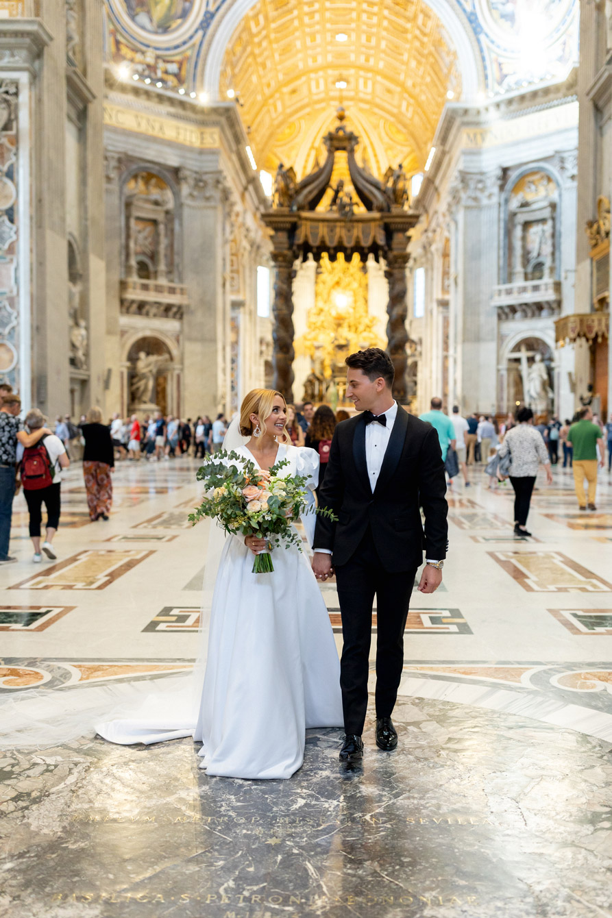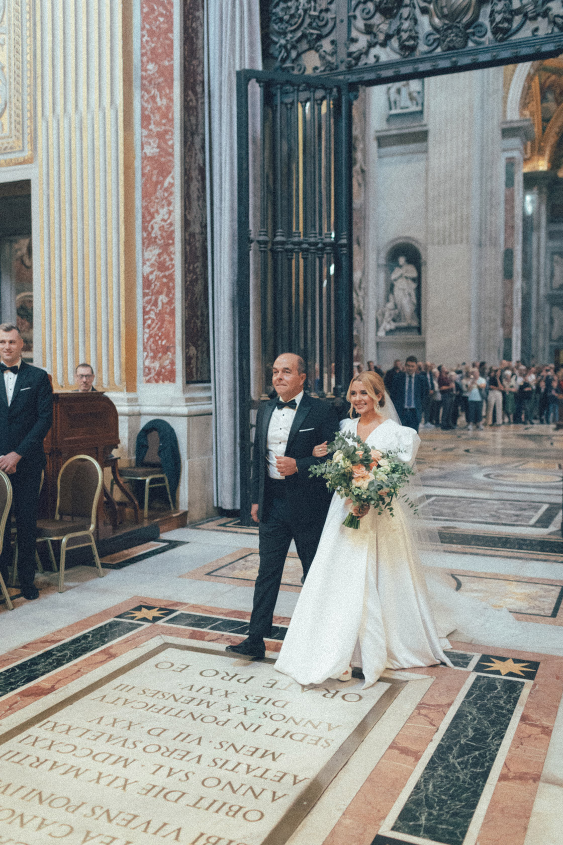 Gabriela & Matthew, a deeply spiritual couple, chose to celebrate their Catholic wedding in Rome at St. Peter's Basilica in Vatican City, one of the most sacred and awe-inspiring wedding ceremony locations in the world. Bathed in warm afternoon light, they exchanged vows surrounded by the timeless beauty and grandeur of this extraordinary basilica.